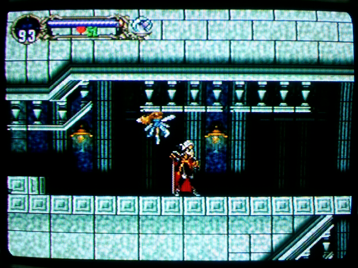 この少し左の位置から右に(気持ち)2フレームくらい歩く。歩きつつ(右キー押しながら)ハートリペア使用。ハートリペアの演出中に大体画像の位置に来ていれば良い。アルカードのつま先と、足下の「回」みたいなタイルとの位置関係を目印にすると良い。