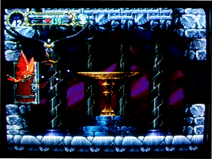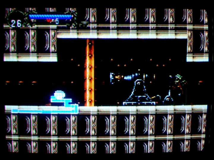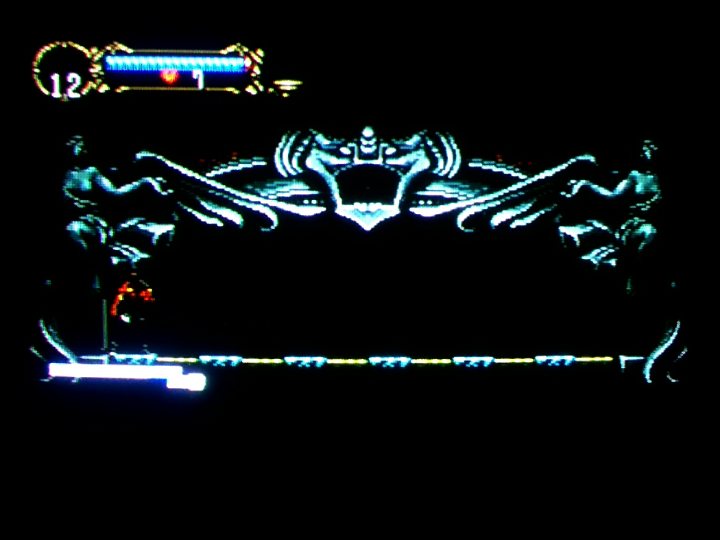 この少し左の位置から右に(気持ち)2フレームくらい歩く。歩きつつ(右キー押しながら)ハートリペア使用。ハートリペアの演出中に大体画像の位置に来ていれば良い。アルカードのつま先と、足下の「回」みたいなタイルとの位置関係を目印にすると良い。