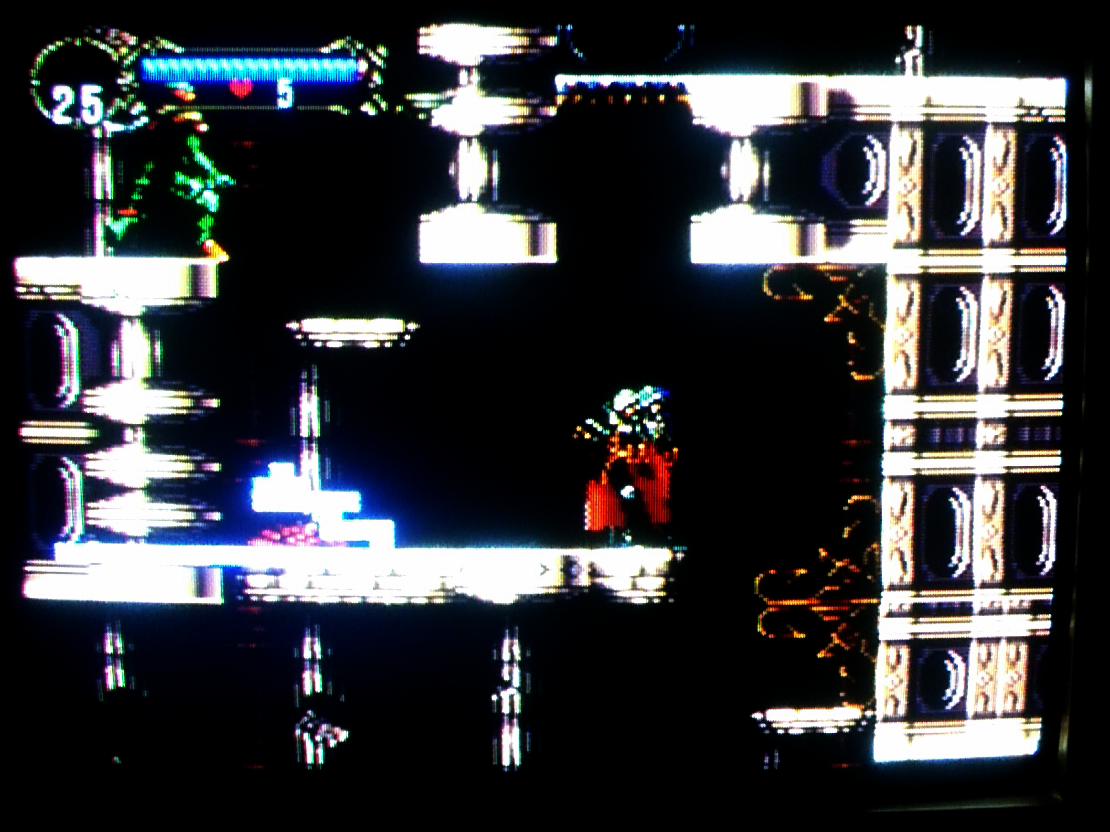 まず針部屋に入る。針部屋の切り替え判定の直前に右向きで立って、左キーを一瞬押してベルタワーに切り替える。右キー押して(気持ち)2フレーム後あたりにハートリペア。で、バックダッシュ押しっぱなし。バックダッシュ後に反射神経でジャンプして蝙蝠変身。蝙蝠で上昇して、足場に頭擦って右へ移動。